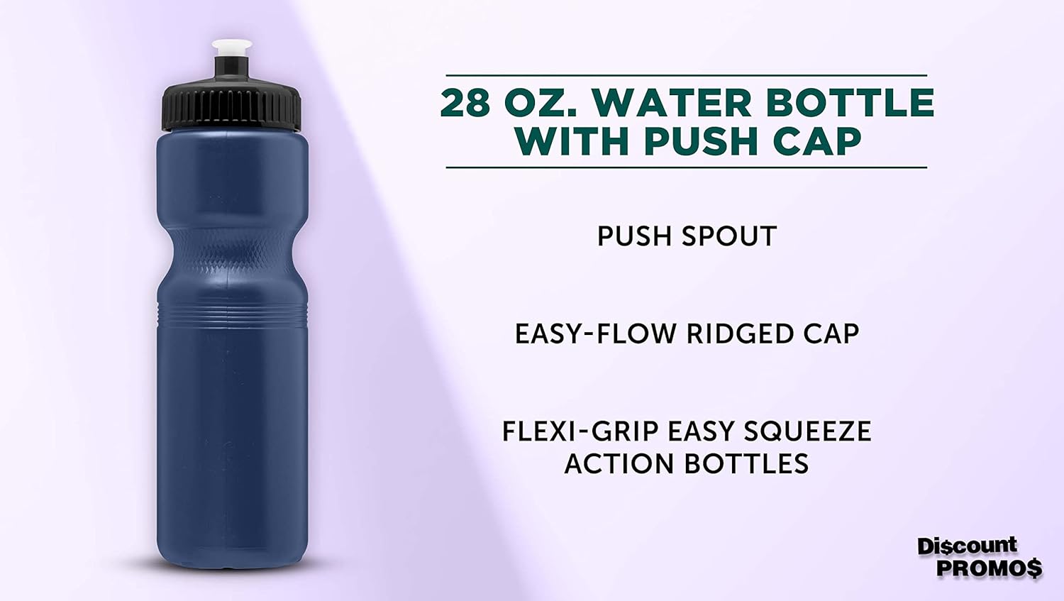 PLASTIC WATER BOTTLES – 28 Ounce Push Cap Plastic Water Bottles are perfect for the car, office, and gym. The ridged cap provides you with peace of mind knowing your water is not going to spill. Never worry again while you are on-the-go.