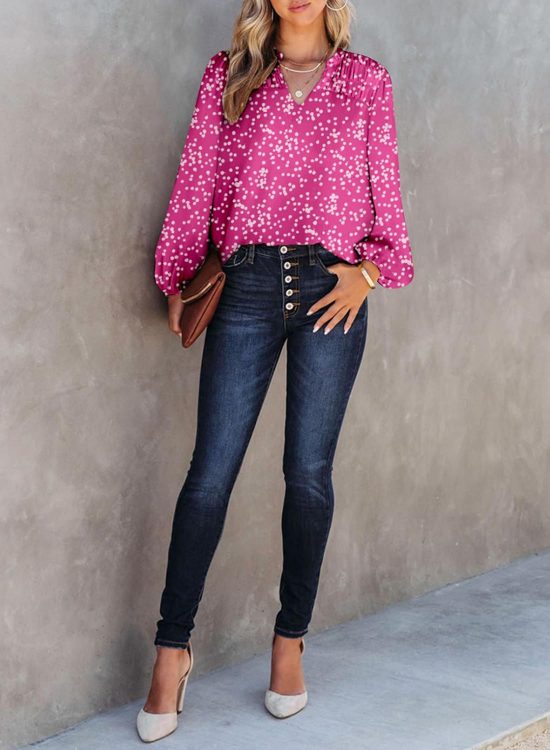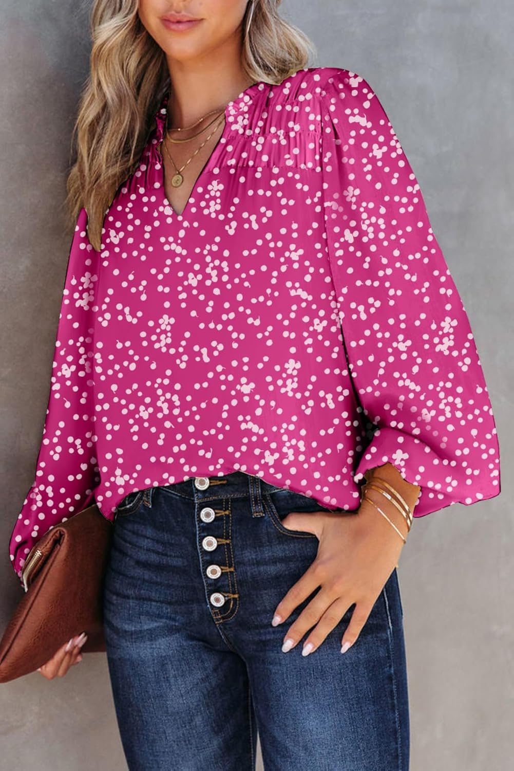 Dokotoo Women’s Casual V Neck Alicia Floral Print Smocked Long Sleeve Chiffon Blouses Bohemian Top Shirts