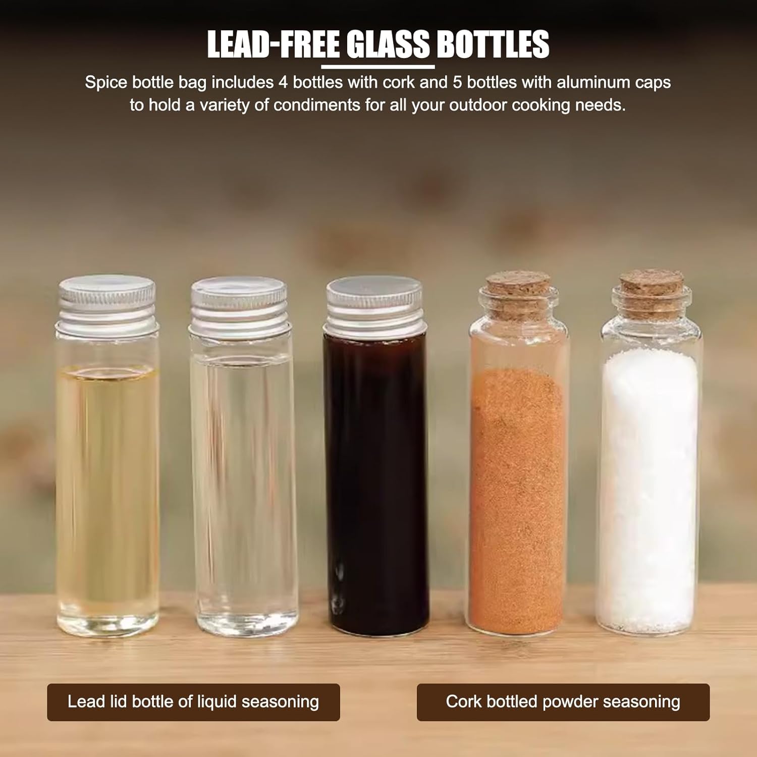 Stay Organized Anywhere: Elevate your picnics, camping, and travel experience with our 9-piece Mini Tube Spice Bottle Kit. The wet wax canvas Spice Bottle Bag, with a convenient hanging cord, keeps your favorite spices accessible. Stay organized effortlessly!