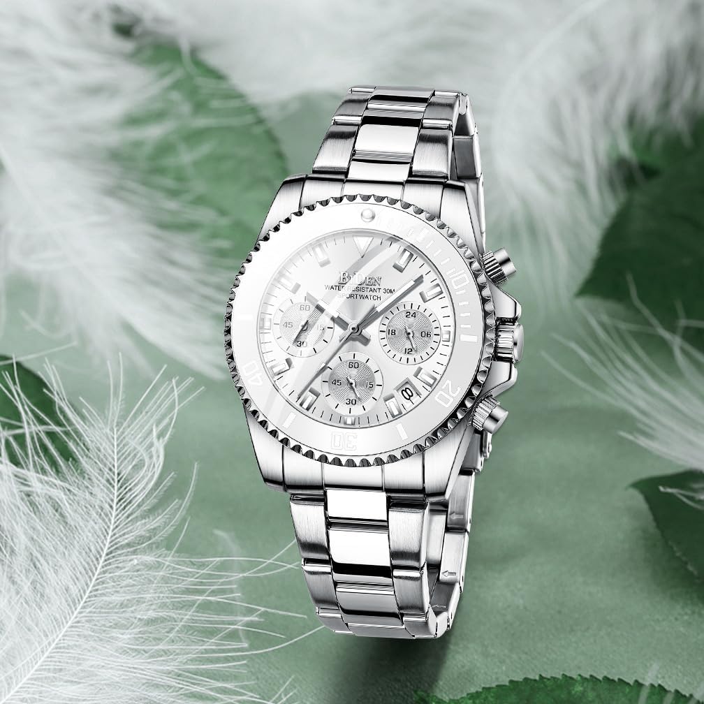 FANMIS Women Elegant Chronograph Rotatable Bezel Mineral Glass Luminous Watch Stainless Steel Waterproof Date Analog Quartz Watch Fashion Business Dress Wrist Watch