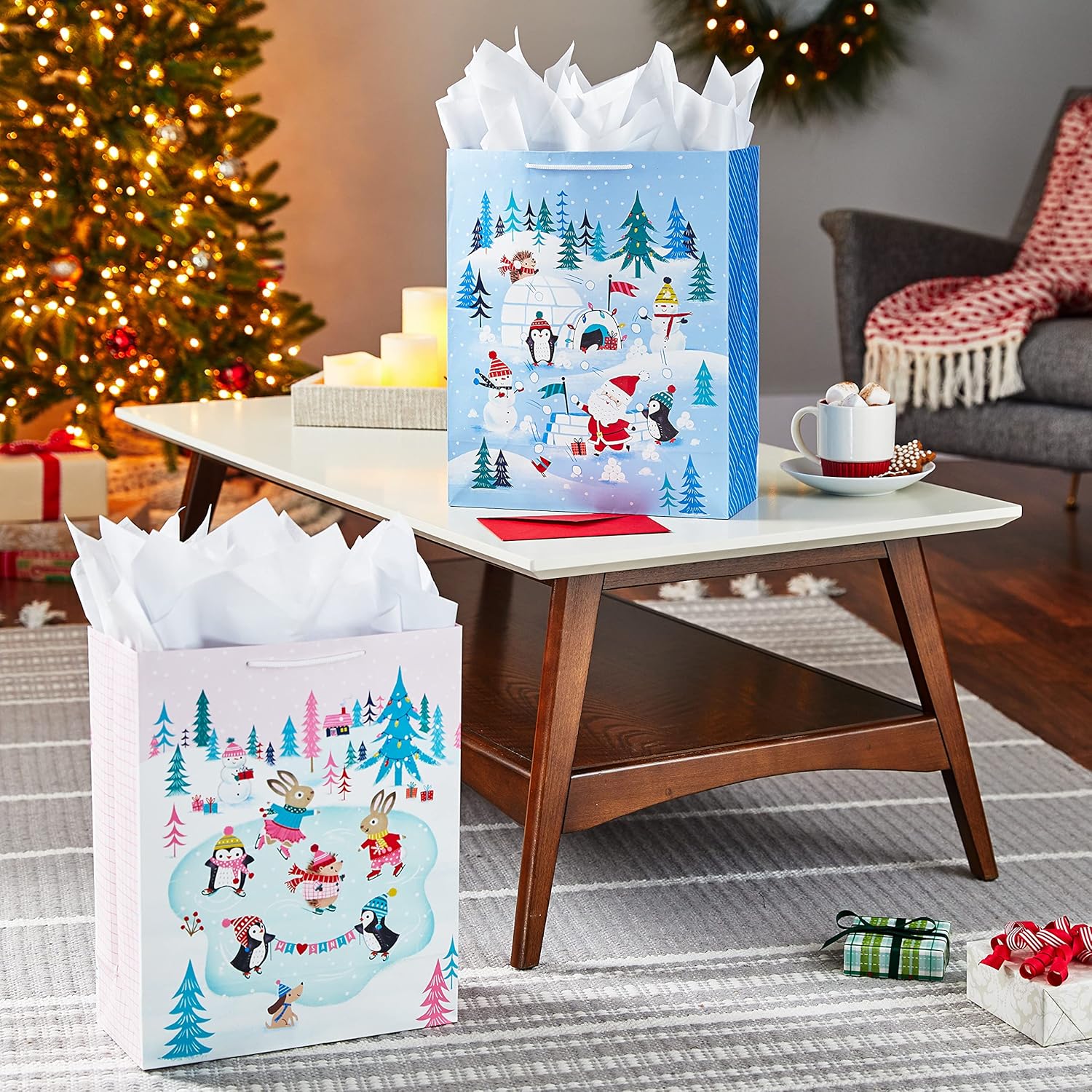 Hallmark 15″ Christmas Gift Bags (2 Extra Large Bags: Pink and Blue, Penguins, Hedgehogs, Santa, Snowmen, Dog, Bunny Rabbits) for Kids, Grandchildren, Winter Baby Showers