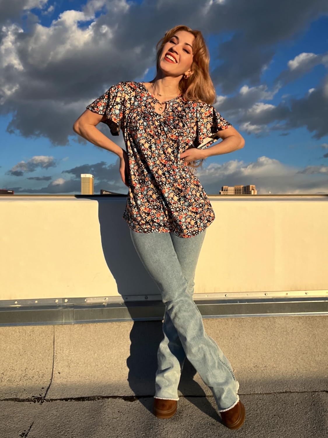 Cute Tunic Tops Basic Tees Blouses Floral Loose Fit Pleated Boho Top