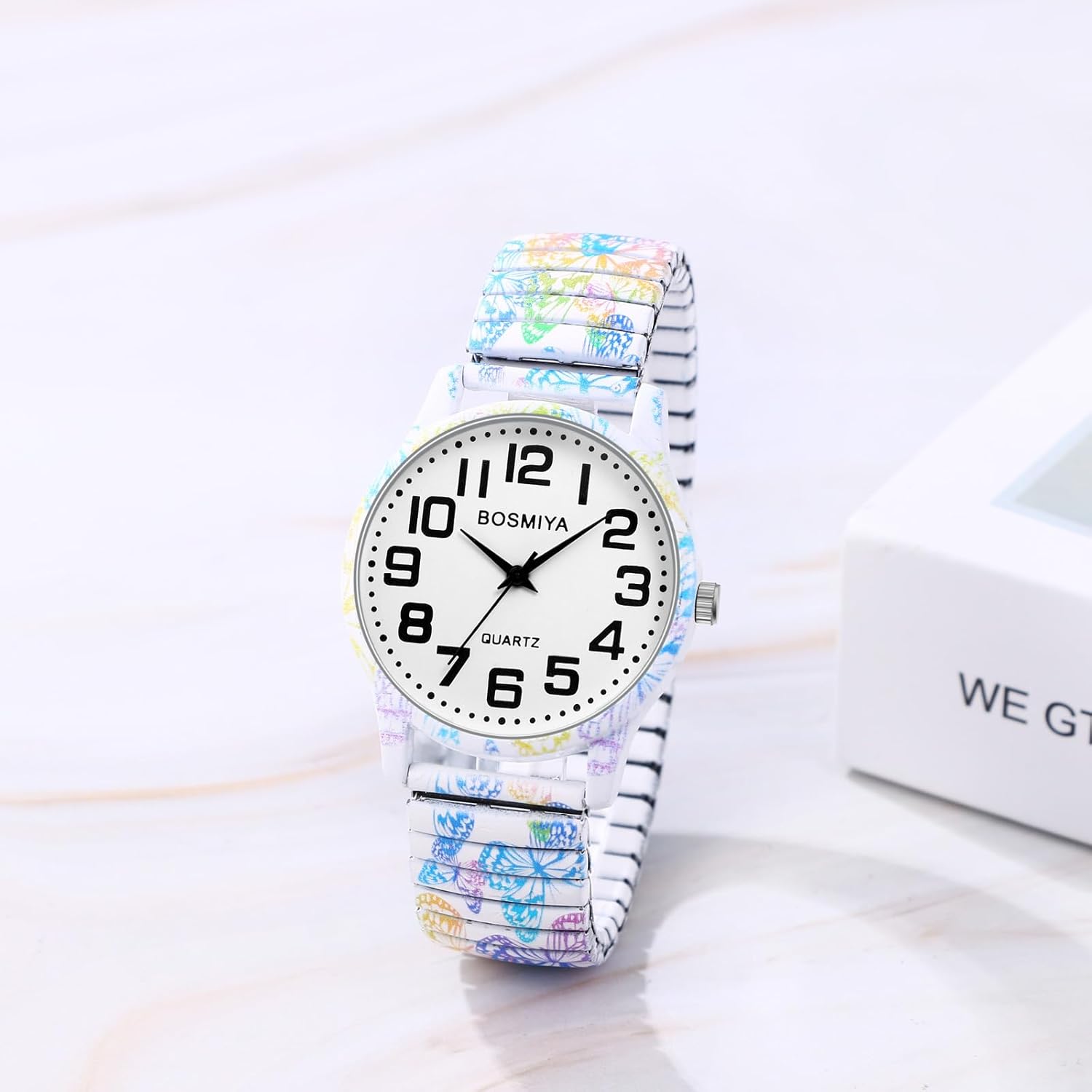 JewelryWe Womens Stretch Band Watches: Easy Reader Analog Quartz Elastic Watch Casual Floral Expansion Band Wristwatch