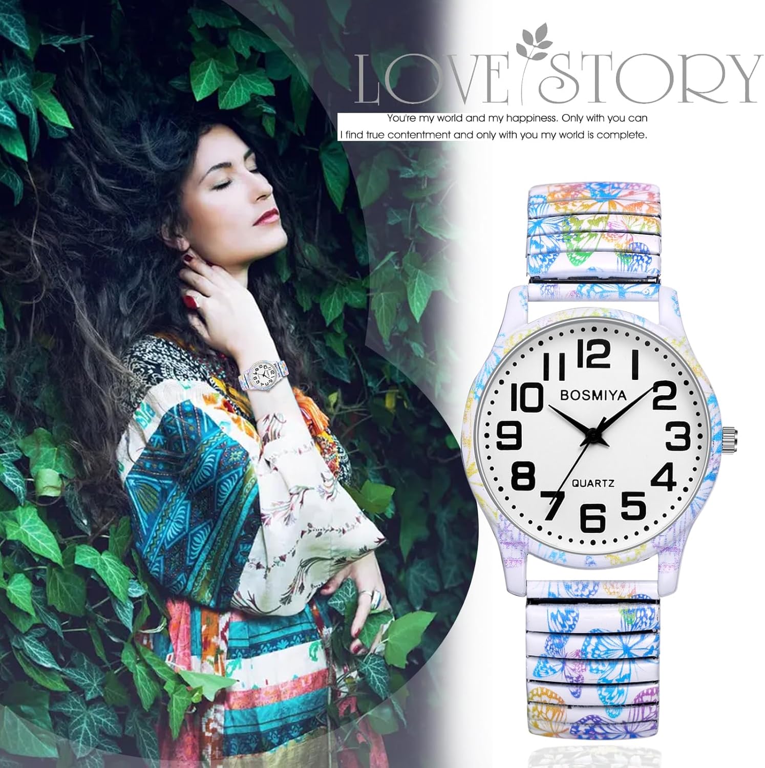 JewelryWe Womens Stretch Band Watches: Easy Reader Analog Quartz Elastic Watch Casual Floral Expansion Band Wristwatch
