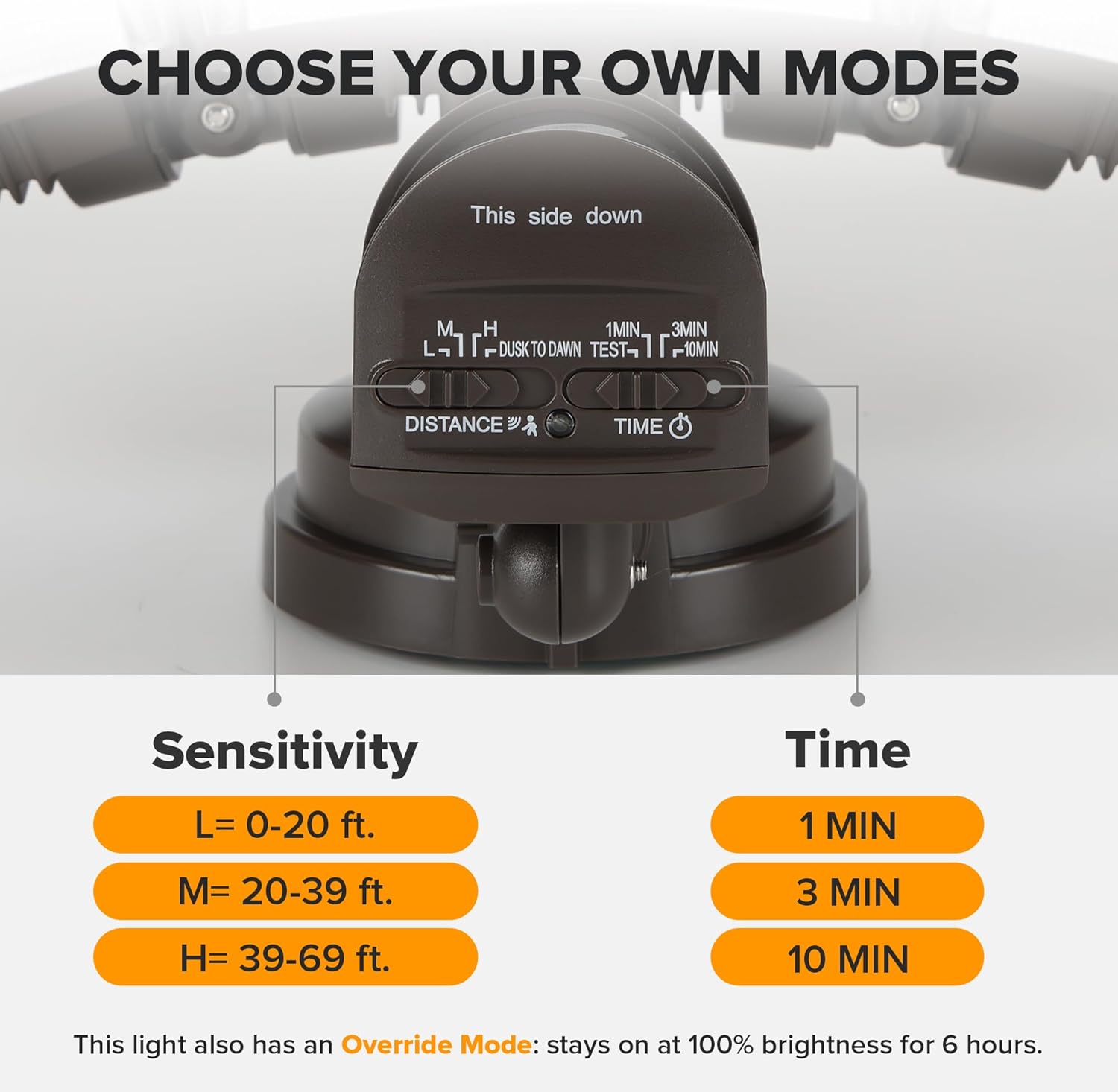 4 LIGHTING MODES: Test Mode, Security Mode, Dusk to Dawn Mode and Manual Override Mode. Manual override mode allows light to operate constantly for selected period of time. Deactivates during daylight hours. More choices can meet different demands for each customer. Choose the most appropriate mode for your needs.