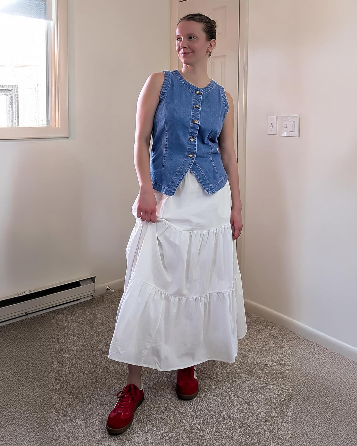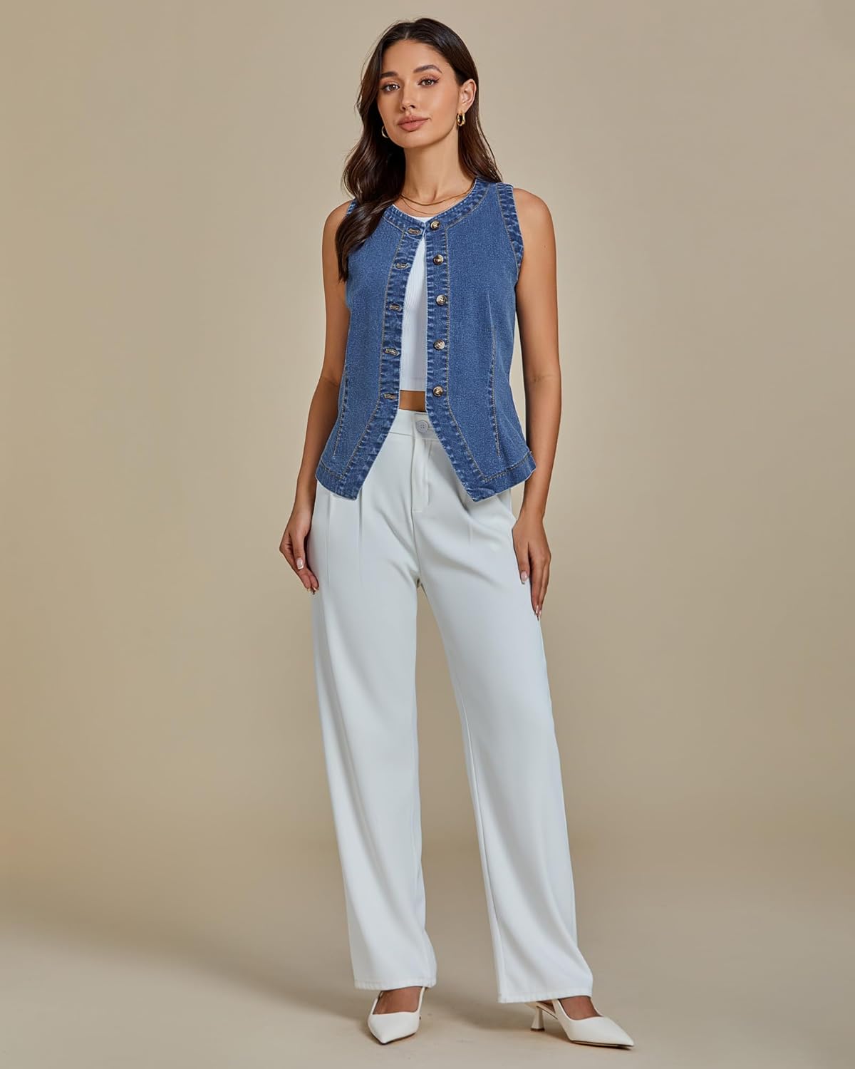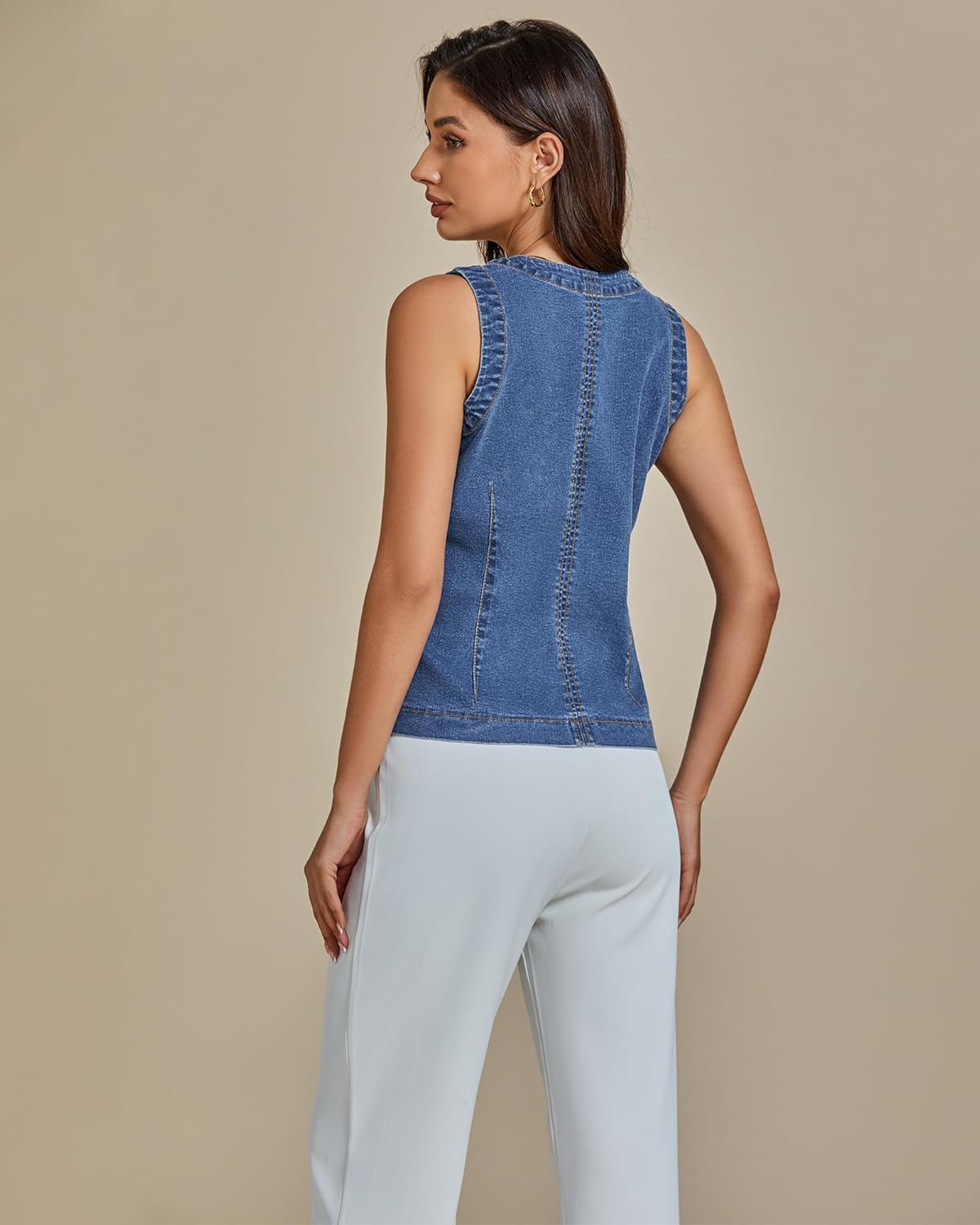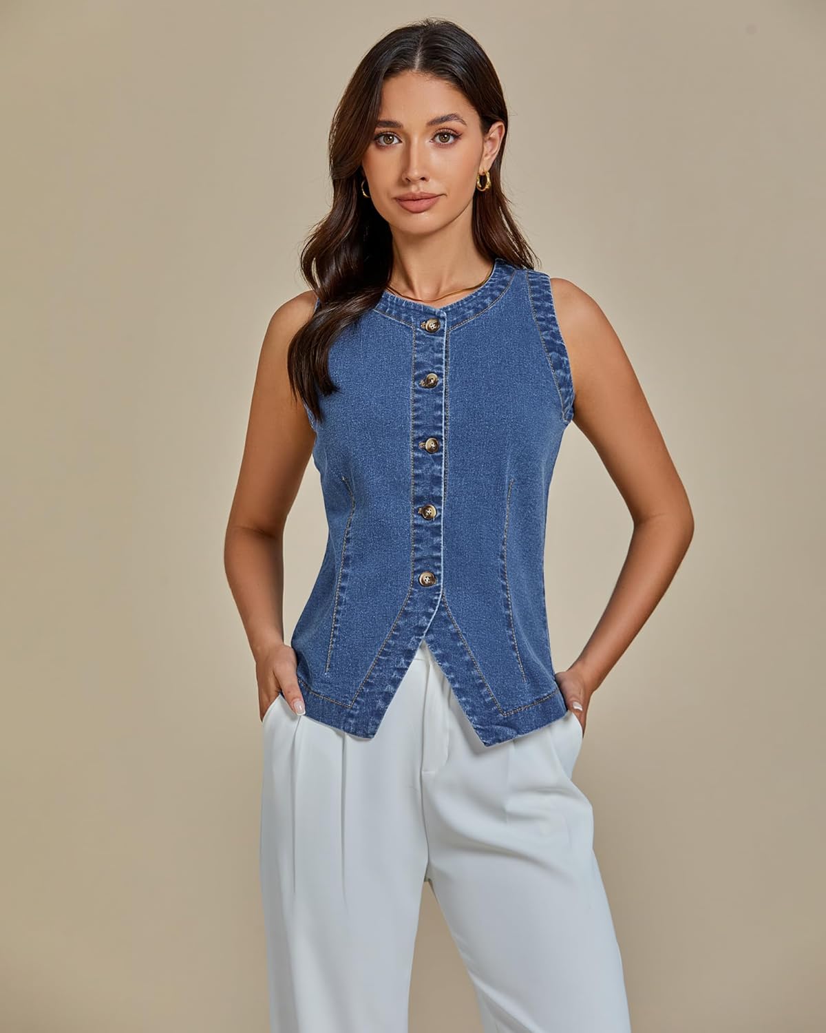 luvamia Denim Vest for Women Sleeveless Strechy Jean Vest Top Button Down Crewneck Casual Summer Western Tank Waistcoat