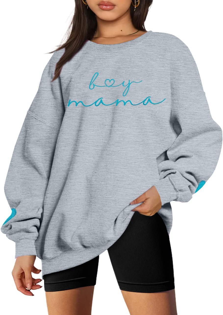 MYHALF Women Mama Oversized Crewneck Sweatshirt: Momma Embroidered Shirt Funny Mom Letter Print Long Sleeve Pullover Tops