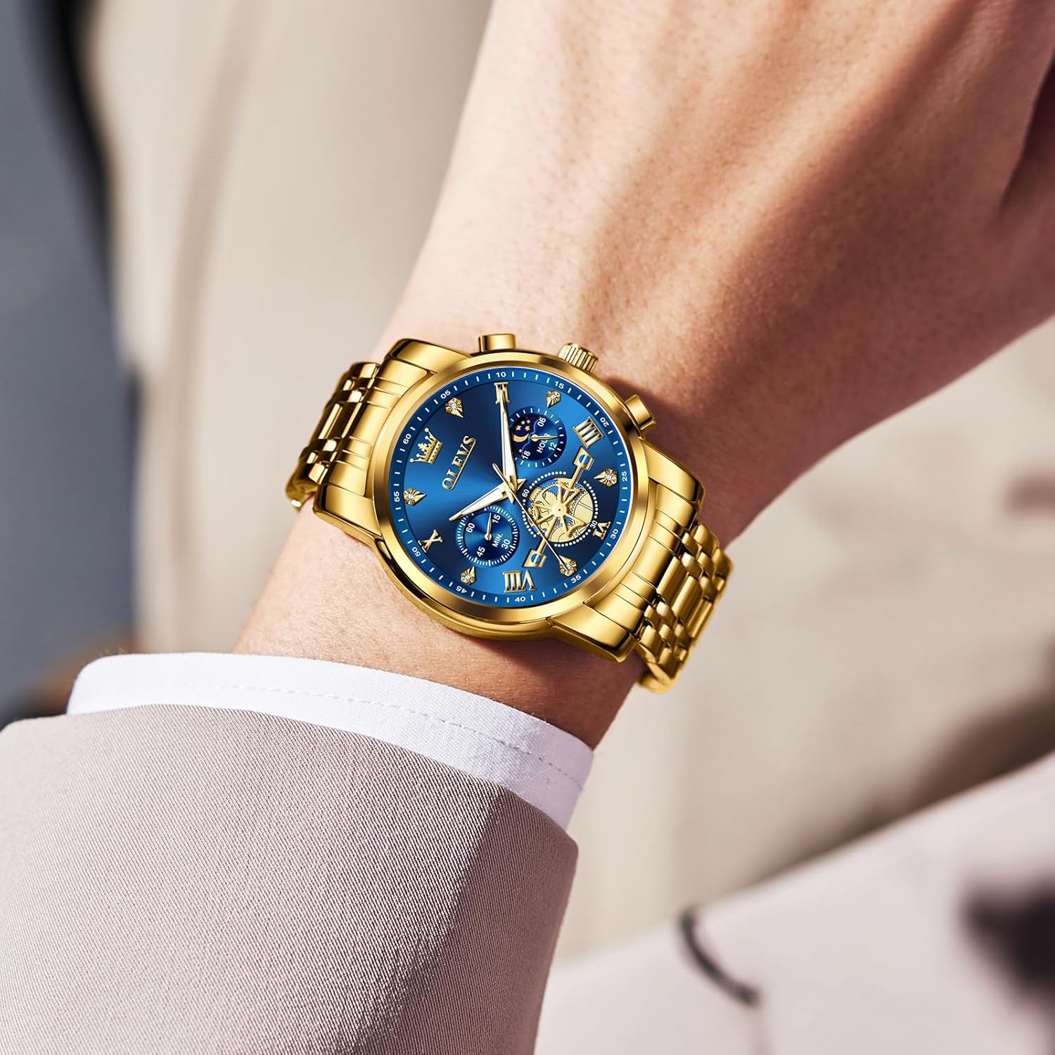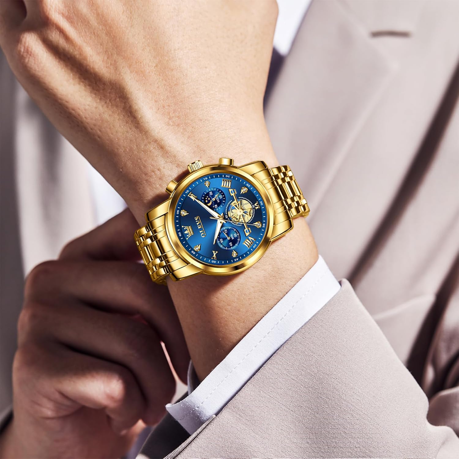 OLEVS Men Watches Stainless Steel Chronograph Watch, Large Wrist Analog Quartz Watch, Fashion Waterproof Diamond Roman Numerals Dress Watches for Men, Gold/Black/White/Blue/Grey Dial