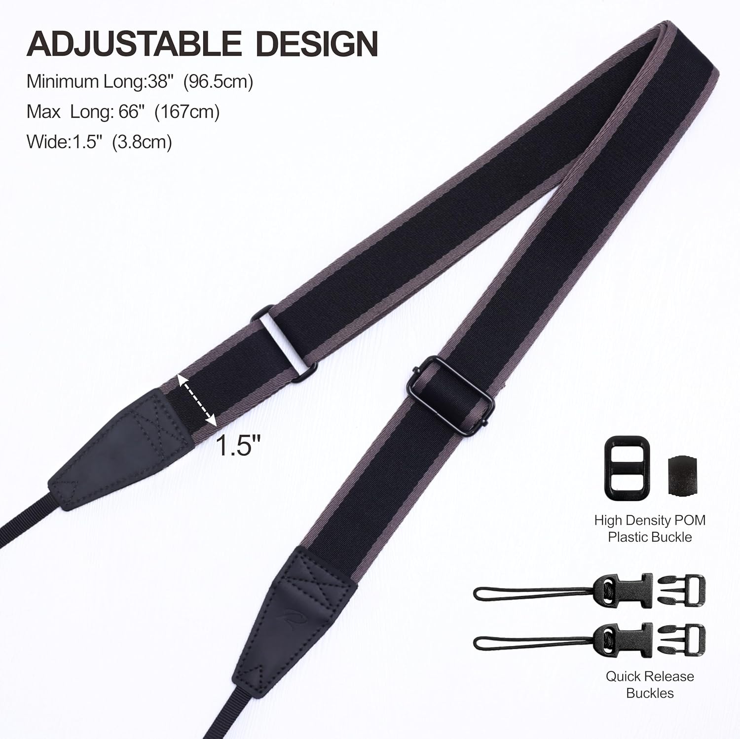 📷ADJUSTABLE CAMERA STRAP:The camera strap adopts an adjustable design, camera strap measures a Minimum 38” Long(96.5cm),Max Size: 66” Long(167cm),can be adjusted as needed. universal for both adults and children,comfortable cotton strap will sit perfectly without slipping and comes with 2 free quick release buckles, compatible with all cameras, binoculars and Drone Remote Control.