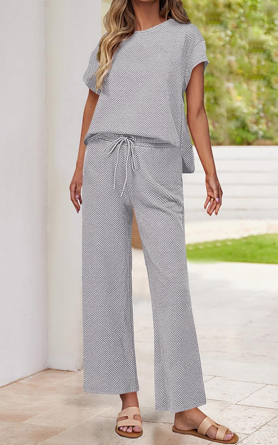 PRETTYGARDEN 2 Piece Outfits For Women Casual Tracksuit Short Sleeve Tops And Wide Leg Long Pants Matching Lounge Sets