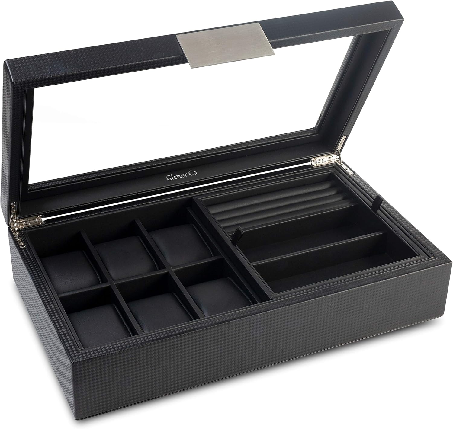 Valet Jewelry Box for Men – Holds 6 Watches, 12 cufflinks, 2 Sunglasses & Tray Storage – Mens Watch Case – CarbonFiber Organizer w Metal Accents, PU Leather & Large Glass Lid – Black