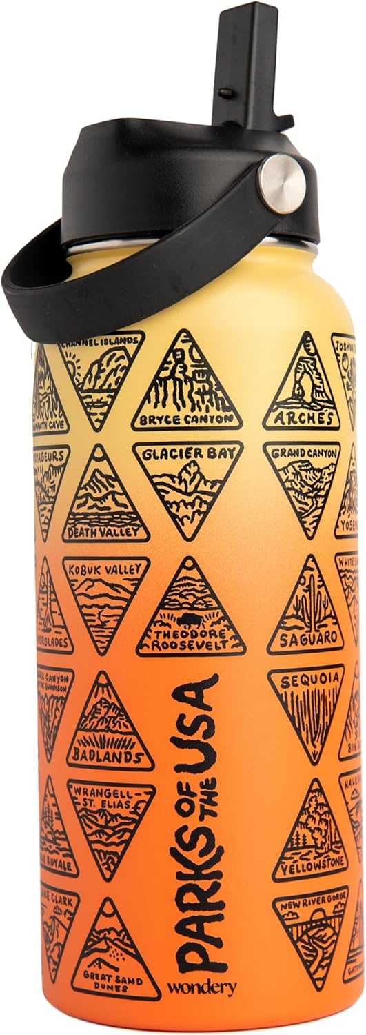 We’ve designed unique depictions of your favorite parks in a beautiful screen printed detailing, along with vibrant corresponding stickers that will be sure to strike conversation on the trail, at work, or in the classroom. What better to commemorate your journeys than crossing parks off your bucket list? 3% of every purchase of all Parks of the USA bottles will go to National Parks Conservation Association (NPCA), to inspire and inform the public about these incredible places, helping to ensure that our parks can be explored now, and for generations to come. The bucket list water bottle can be washed with the stickers on, The straw is hard plastic , The outside coating is Stainless Steel Construction and Color Powder Coat Finish